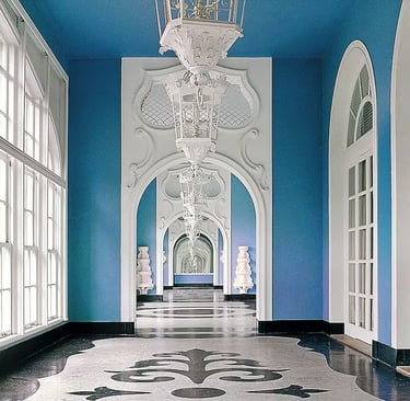 Aves paradisíacas de verdad, en una enorme jaula diseñada por Draper, decoraban uno de los salones. Las flores y plantas del papel de las paredes se inspiraban en ilustraciones botánicas del siglo XVIII, y los muebles, diseñados a medida, los mandó hacer con maderas tropicales como la jacaranda. Los suelos de ajedrez conviven con los mosaicos de estilo portugués y fuentes barrocas. El gran salón del casino rechazó pintarlo de rojo: para Dorothy Draper apostar era pecado, así que en vez de ese color eligió uno azul marino que pensó que ayudaría a templar las pasiones de los jugadores.