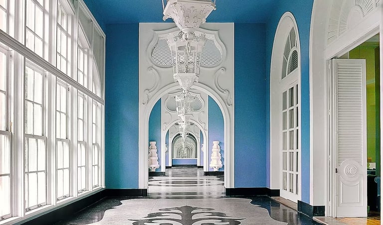 Con más de 400 habitaciones, un salón de juegos con una cúpula mayor que la de la Basílica de San Pedro, teatro, piscina, e innumerables pasillos y vestíbulos, el Palácio Quitandinha se alza a los pies de las montañas de Petrópolis, una ciudad famosa por haber sido el retiro veraniego de la antigua familia imperial brasileña. Por fuera, las falsas vigas de madera de la fachada y sus puntiagudos tejados a lo Tudor le dan un aire de chalet suizo parecido al de muchos otros edificios locales. Por dentro, Draper lo decoró como le dio la real gana. “Cuando entras, parece que estás en el plató de una película de los años cuarenta. La escala y las proporciones son increíbles, y los colores son muy diferentes a los que se suelen ver en Europa”, asegura el fotógrafo francés Matthieu Salvaing, autor de estas imágenes. “No se cómo describirlo. Por el lugar donde está tiene un toque surrealista, como un ave del paraíso que se hubiera encaramado en una montaña de Baviera”.